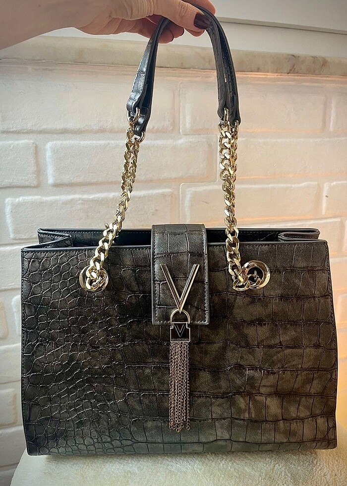 VALENTINO GRİ OMUZ ÇANTASI. Etiketleri olmasa da tamamen yeni sayılır, bir kez bile kullanılmadı. Boyutlarıyla oldukça kullanışlı: 31x26x11 cm. İç kısmı, 1 fermuarlı bölme ile 2 ana bölmeye ayrılmış. Ön bölümde 2 kayar bölme ve arka bölümde ise 1 fermuarlı bölme bulunuyor, bu da çantanızı düzenli tutmanızı sağlıyor. Ayrıca, güçlendirilmiş tabanı sayesinde oldukça stabil ve dayanıklı. Alıcısına şimdiden hayırlı olsun!