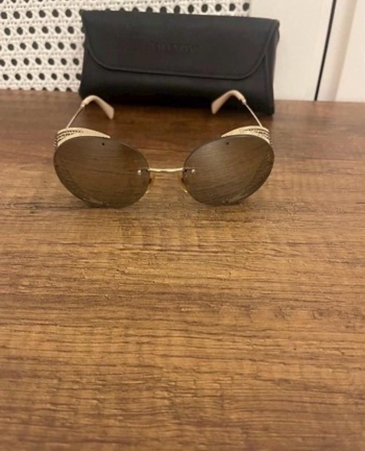 Parlak kadın güneş gözlüğü, tokalı detaylarla bohem ve retro tarzını yansıtıyor. Siyah kılıf ile birlikte. valentino