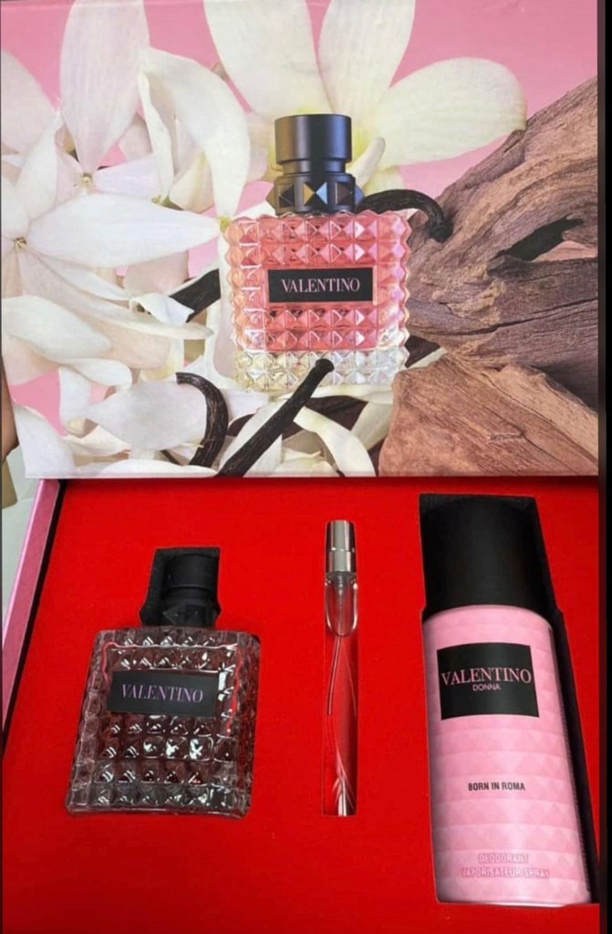 Valentino kadın parfüm seti, kabartmalı cam şişe, ince sprey şişesi ve 'Born in Roma' yazılı pembe şişe içerir. Ambalaj çiçek ve odun detaylıdır.