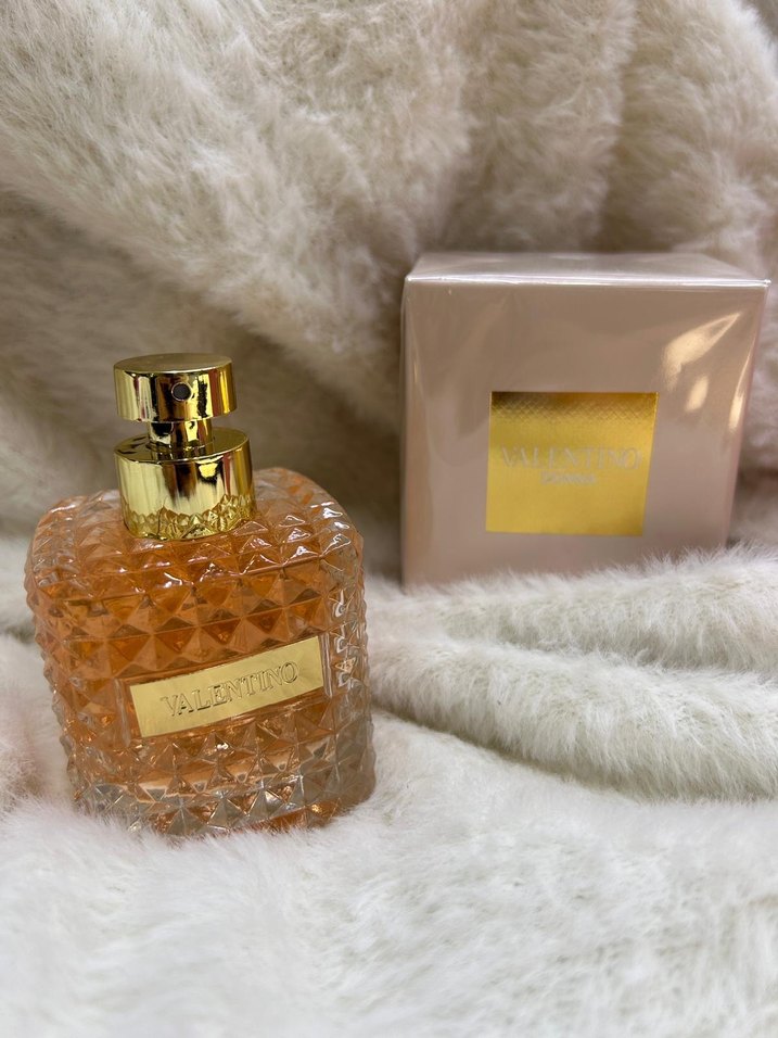 Altın kapaklı, kesme cam şişede Valentino kadın parfümü. Bej kutusunda, altın detaylı.