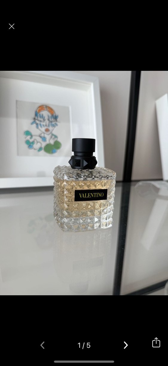 Valentino kadın parfümü, siyah kapaklı dokulu cam şişede, zarif bir koku sunar. Çok az kullanıldı 100ml
