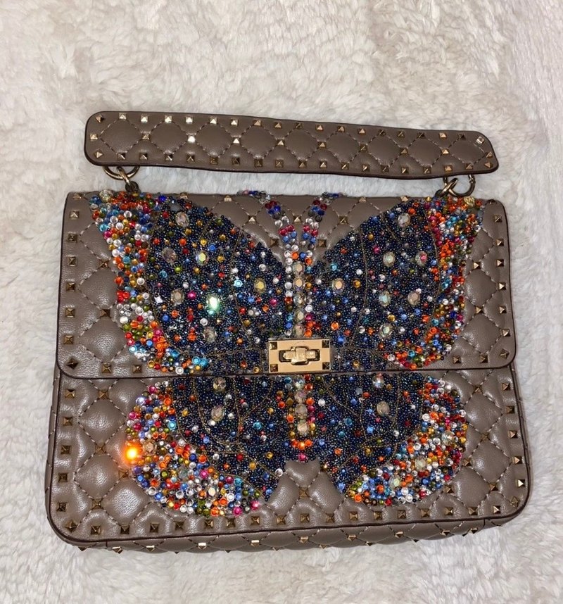 İthaldir gerçek deri , Koyu renk deri kadın çanta, işlemeli kelebek deseni ve payet detaylarıyla, çivili askıya sahip bohem tarzda.