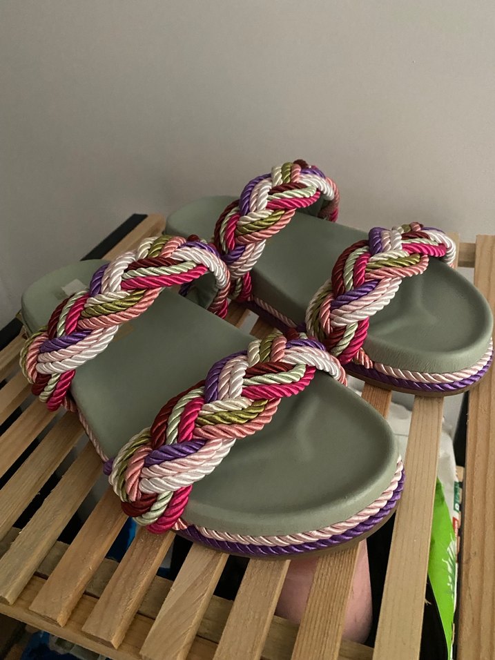 Çok renkli örgü bantlar ve platform topuklu bohem tarzı kadın sandaletleri. Elastik detaylar rahat kullanım sağlar, parti için uygun. Bir kere kullanılmıştır