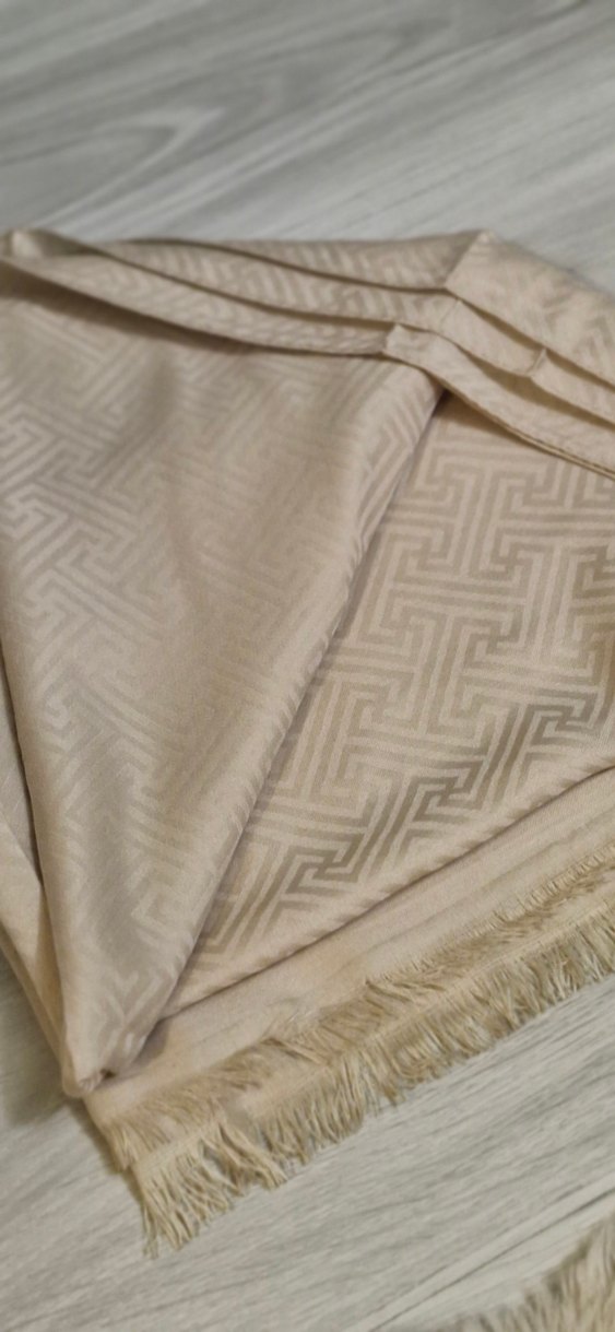 Kadınlar için bej renkte, saten dokulu, geometrik desenli ve drapeli şal, sade ve rahat bir stil sunar.