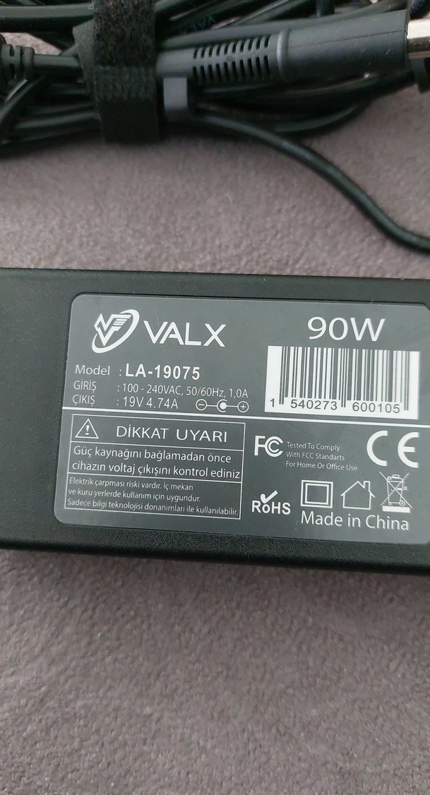 Valx marka, 90W gücünde siyah şarj adaptörü. Giriş: 100-240VAC, 50/60Hz, 1.0A. Çıkış: 19V, 4.74A. Güvenlik uyarıları ve sertifikalar içerir. ⚡