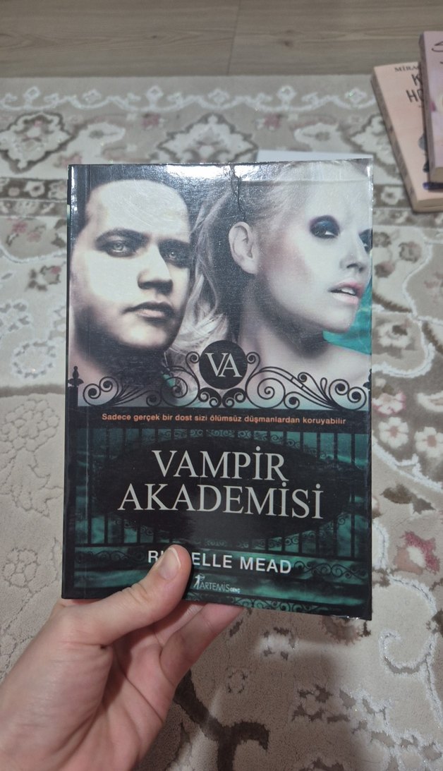 Elle Mead'in Vampir Akademisi adlı romanı, ölümsüz düşmanları konu alan karanlık ve gizemli bir hikaye sunuyor. Kapakta iki karakter yer alıyor. ♂️