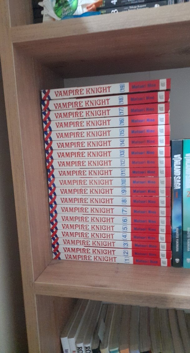 Vampire Knight çizgi roman serisi, 19 ciltlik tam set olarak rafta düzenli şekilde yer alıyor. Ciltler kırmızı ve beyaz renklerde.bazılarında hasarlar vardır ucuza satılır