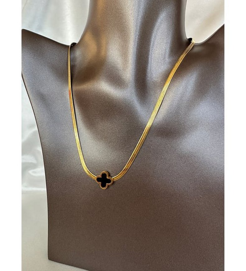 kullanilmadi. Uzun altın renkli zincir detaylı, siyah yonca figürlü minimal desenli kolye, günlük kullanıma uygun.