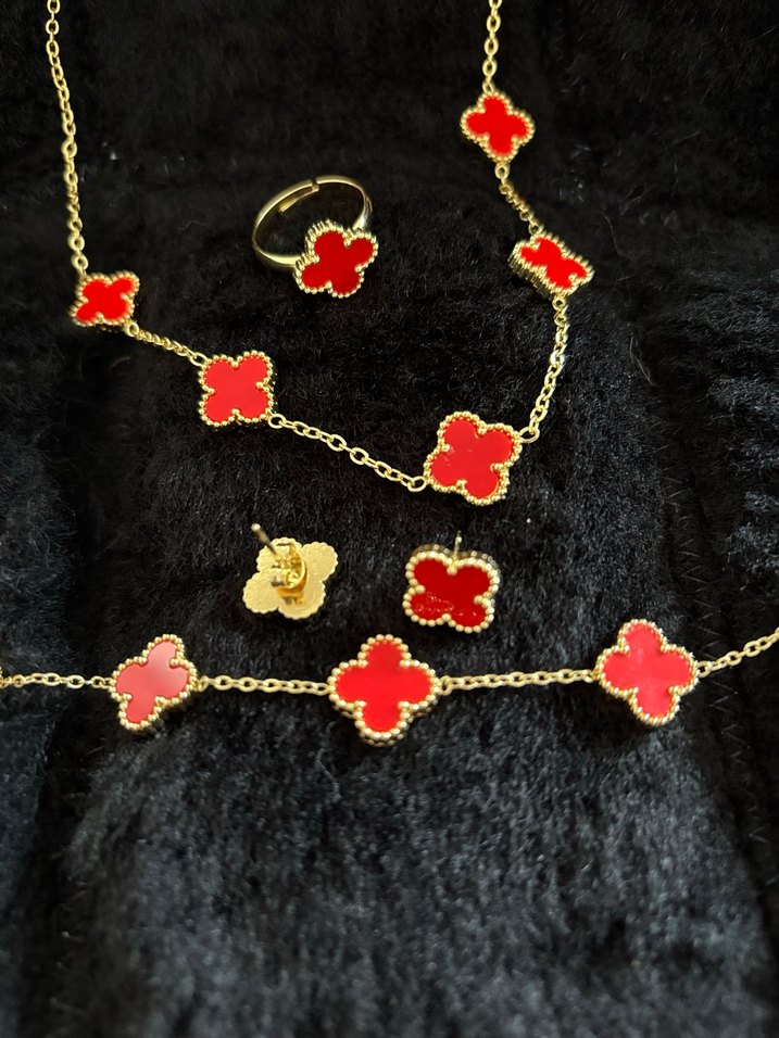 Canlı kırmızı nakışlı yonca desenleri ve zincir detaylı kısa boy kolye, günlük kullanıma uygun cesur bohem tarzını yansıtıyor.
