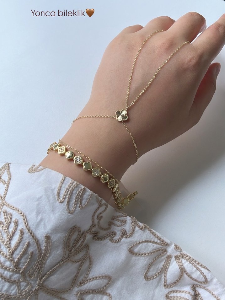 Altın renkli, zincir detaylı yonca figürlü bohem tarz bileklik. Günlük kullanıma uygun, hafif ve zarif tasarım.