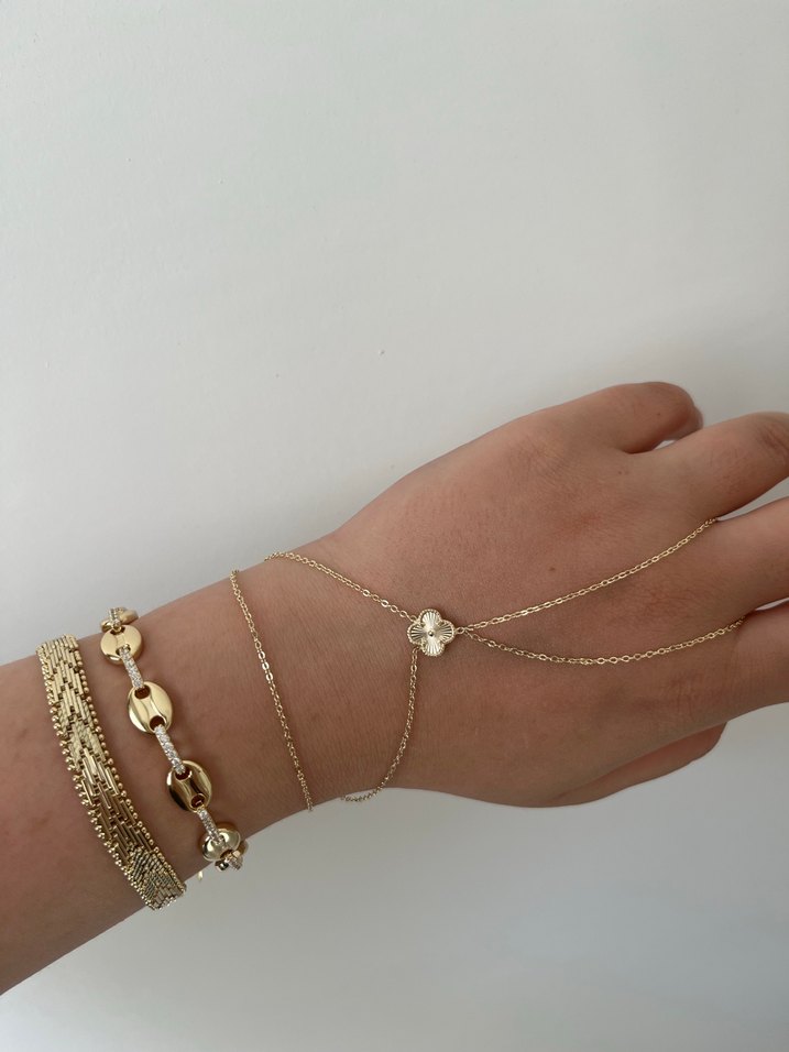Altın renkli, zincir detaylı ve küçük çiçek figürlü kadın el zinciri. Minimalist ve bohem tarzda, günlük kullanıma uygun.