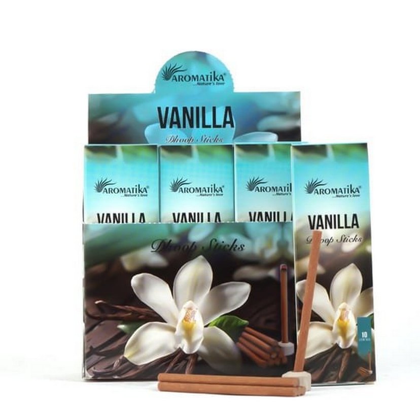 Aromatika markasına ait vanilya kokulu tütsü çubuğu, hafif ve hoş bir koku sunar. paket içinde 10 adet dhoop tütsü bulunmaktadır.