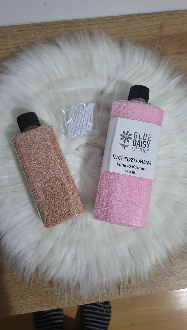Blue Daisy Candle markasına ait 250 gram vanilya kokulu inci tozu mum ve pamuk çubuklar içerir. Rahatlatıcı koku sağlar. ️