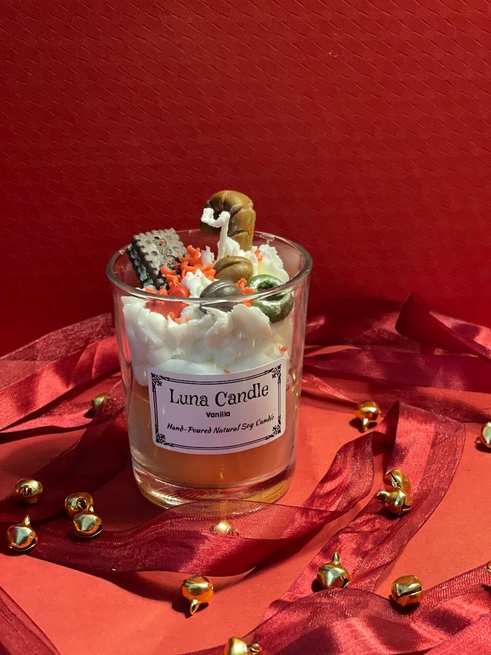 Vanilya kokulu, el yapımı ve renkli mum süslemeleriyle cam bardakta. El yapımı olduğu için her ürün kendine has ve benzersizdir.