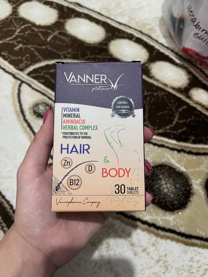 Vanner saç ve vücut sağlığını destekleyen vitamin, mineral, aminoasit ve bitkisel kompleks içeren 30 tabletlik kutu. Zn, D ve B12 vitamini içerir.