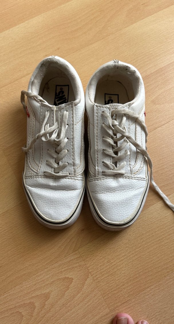 Beyaz, bağcıklı, düz tabanlı kauçuk tabanlı kadın spor ayakkabısı, minimal sokak tarzında gündelik kullanım için uygun. Birçok kere kullanıldı. Tabanın yanlarında ufak çizikler var.