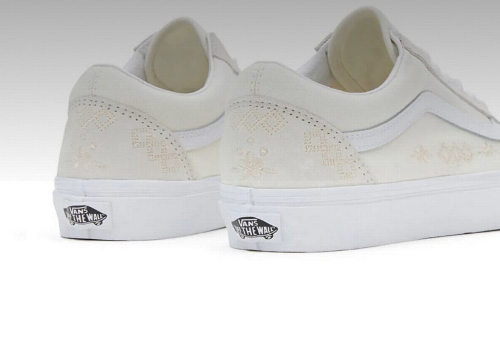 Nakış detaylı beyaz Vans spor ayakkabılar, Minimalist ve bohem tarzı yansıtır, taban kauçuktandır. Topukta Vans "THEWALL" logosu bulunur.