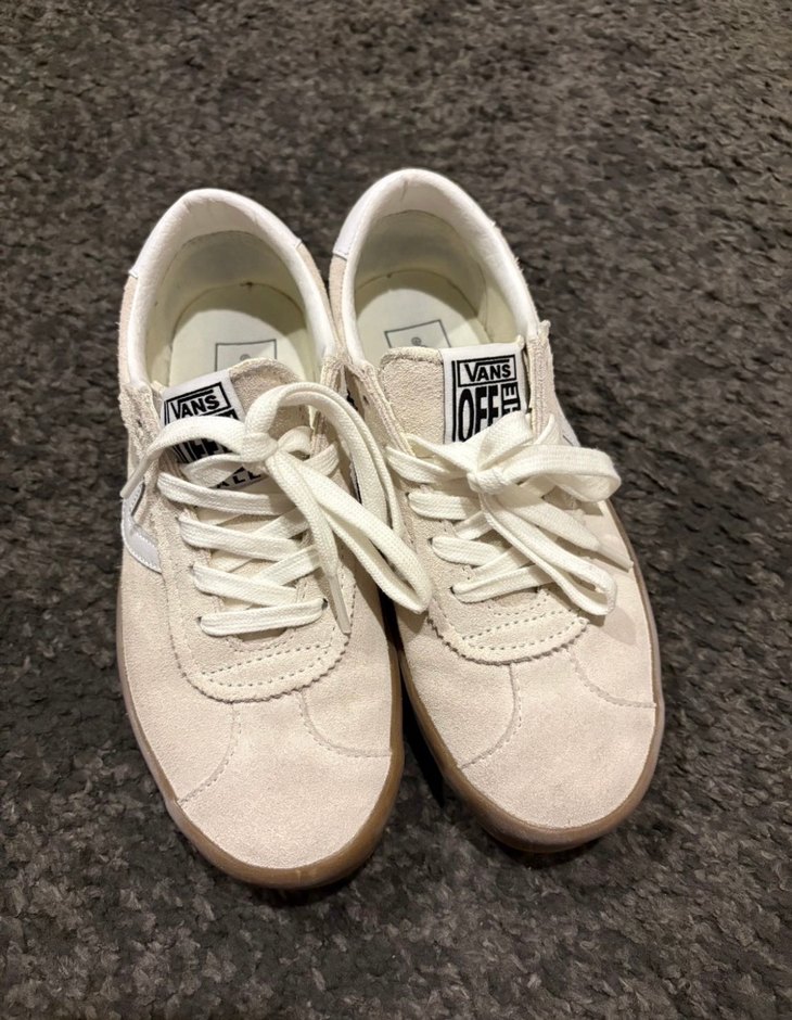 Vans beyaz süet sneakers, düz tabanlı ve pastel tonlarda. Rahat ve şık, günlük kullanım için uygun.