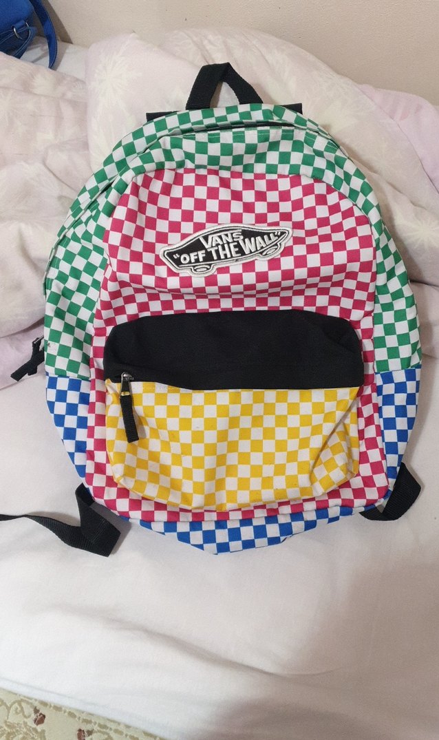 Vans marka, çok renkli kareli desenli, fermuarlı bölmeli sentetik kumaştan sırt çantası.
