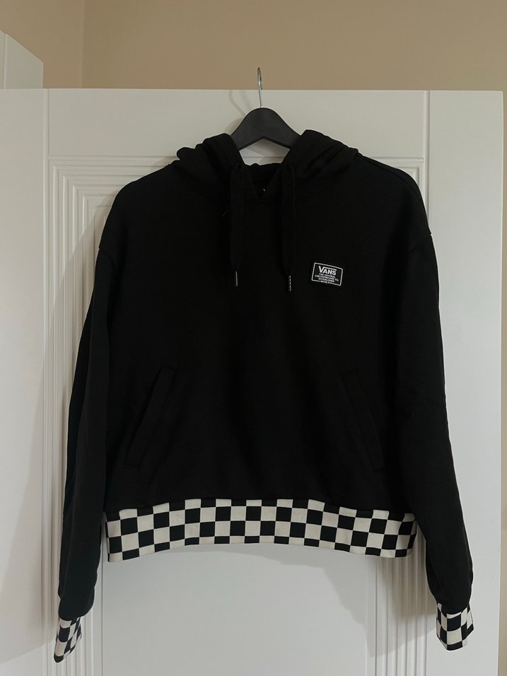 Uzun kollu, bisiklet yaka, bol kesim siyah kadın sweatshirt. Manşet ve etek kısmında kareli desen bulunur. Yumuşak ve sıcak kumaştan üretilmiştir. Medium beden.