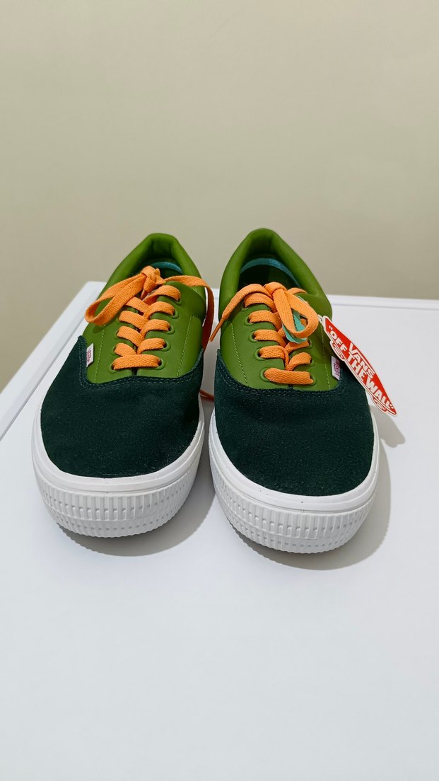 Erkek spor ayakkabı, yeşil ve siyah renklerde, turuncu bağcıklarla ve düz tabanlıdır. Orijinal, günlük ve sokak stiline uygun bir modeldir. Sıfır ve kutuludur.