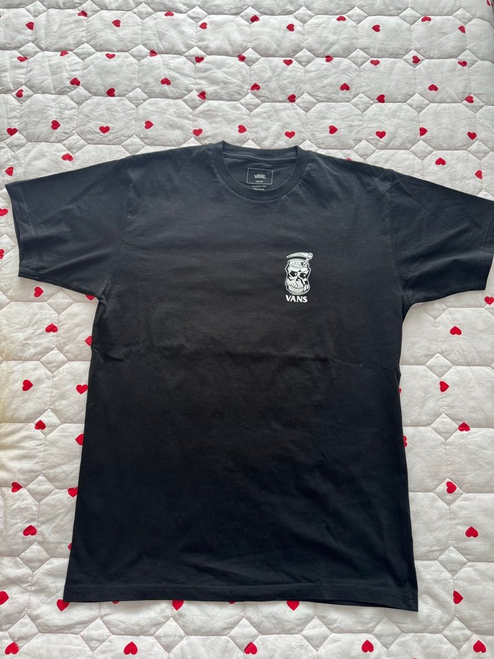 Vans markalı siyah erkek tişört, göğsünde küçük baskılı kafatası deseni ile oversize kesime sahiptir. Kısa kollu, bisiklet yaka ve pamuklu kumaştan üretilmiştir. Vans siyah erkek tshirt hiç giyilmedi önü ve arkasında kurukafa baskılı eni 53cm boyu 70cm
