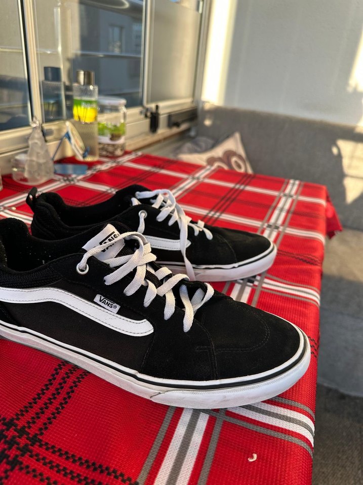Vans markalı siyah-beyaz çizgili dolgu topuklu spor ayakkabılar, bağcıklı ve kauçuk tabanlıdır. Günlük kullanıma uygundur.