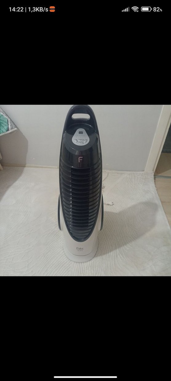 Beyaz ve gri renkte, kompakt dikey tasarıma sahip sağa ve sola hareket etmekte soğuk hava ufluyor Üstünde kontrol paneli bulunur. ️