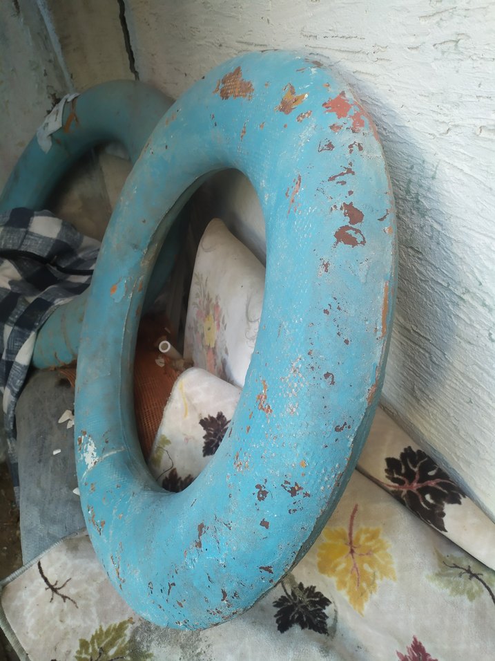 Pastel mavi renkte, kullanılmış vapur yüzme simidi. Havuz veya plajda kullanılabilir. ️