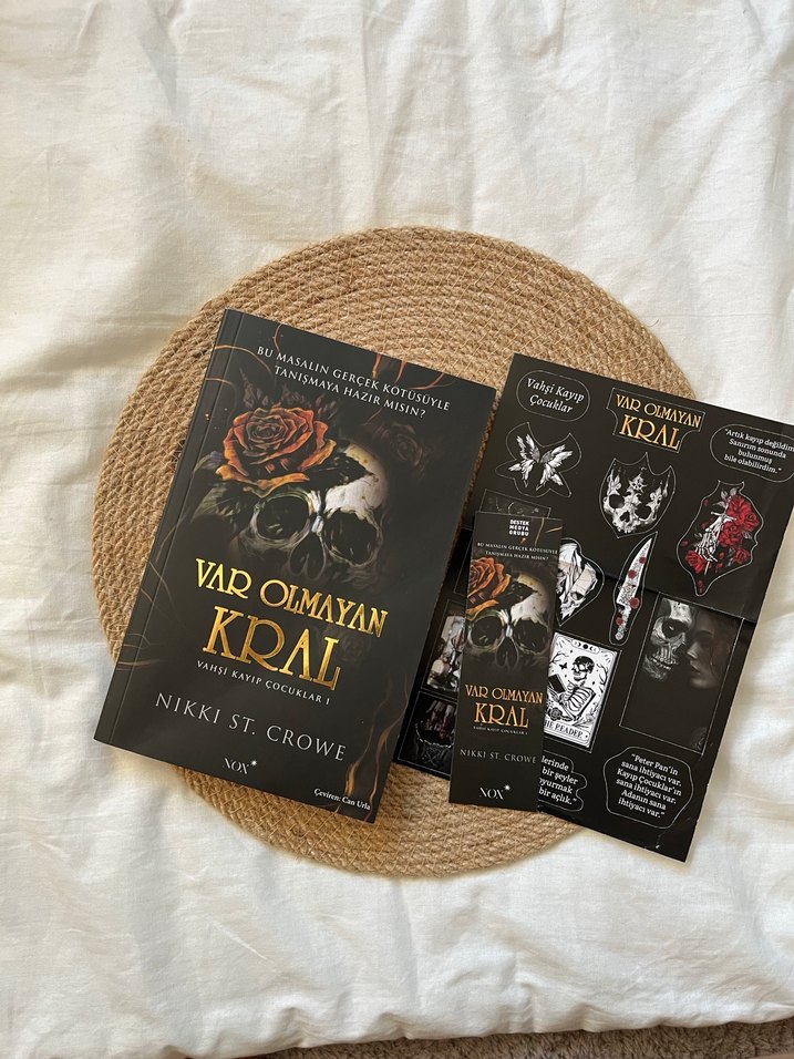 Nikki St. Crowe'nin 'Var Olmayan Kral' romanı, koyu ve yoğun temalar içeriyor, kapakta kafatası ve gül simgeleri bulunuyor.