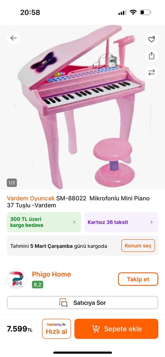 Pastel pembe renkte, 37 tuşlu mikrofonlu mini piyano. Rahat oyun için uyumlu taburesi ile birlikte gelir. Mikrofon tutacağı yoktur ve mikrofon bozuk ama yapılabilir. Çok kullanılmadı bizde. Başka sıkıntısı yok. Çocuğu oyalıyor müzik çalıyor Bluetooth bağlayıp müzik açabiliyorsun. Marka temsilidir.