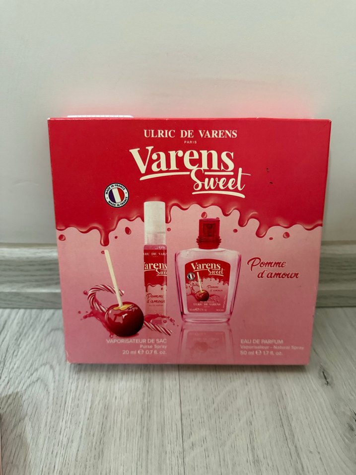 Ulric de Varens Varens Sweet kadın parfüm seti, 50 ml Eau de Parfum ve 20 ml vücut spreyi içerir. Tatlı elma kokusuna sahiptir.