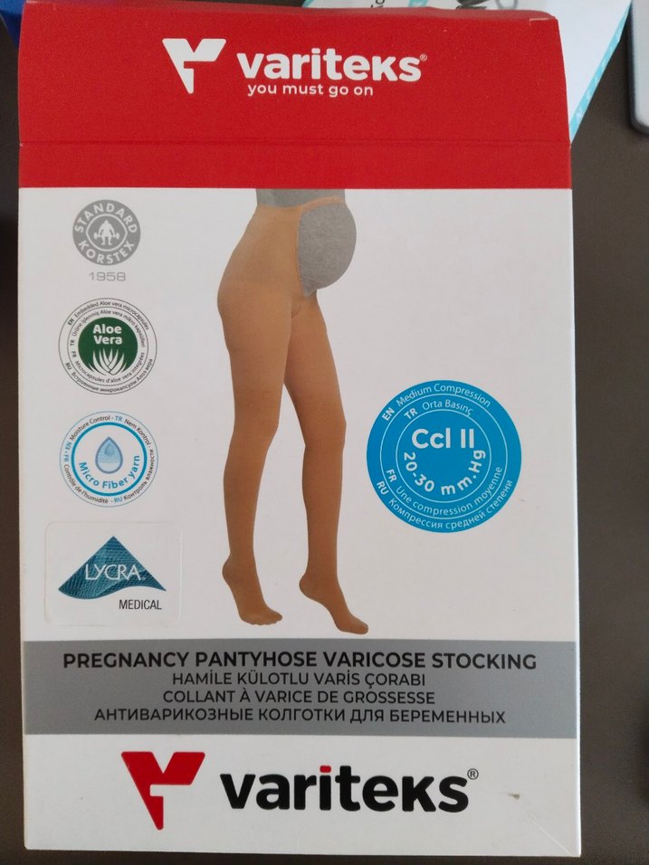Variteks markalı, bej renkli, mini boyda, vücuda oturan hamile varis çorabı. Aloe vera ve Lycra ile desteklenen medikal kompresyon sağlar.