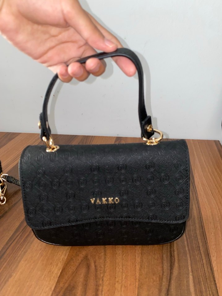 VARKO marka baskılı desene sahip, tokalı saplı siyah deri kadın çantası. Modern klasik ve Paris tarzını yansıtır.