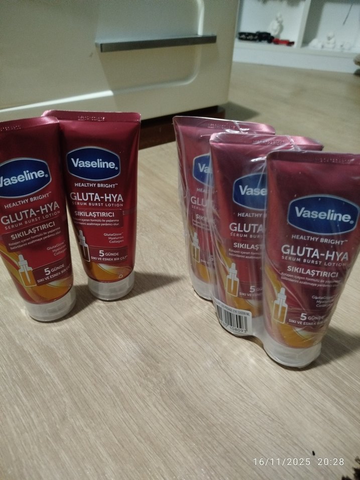 Vaseline Gluta-Hya serum etkili vücut losyonu cildi sıkılaştırır, parlak ve pürüzsüz bir görünüm sağlar. Glutatyon ve Hyaluronik Asit içerir. 5 adetini 850 tl ye vereceğim. Tekli değil toplu olarak satıyorum. Hiç açılmadı ve 1 ay önce satın aldım. Yani Ekim 2025 te satın alındı.