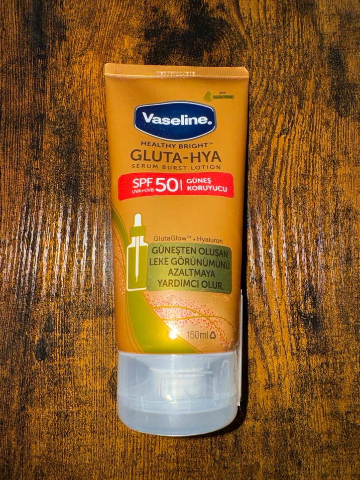Sıfır Jelatinlidir. Vaseline Gluta-Hya serum burst losyon SPF 50 ile güneşten korur, güneş kaynaklı leke görünümünü azaltmaya yardımcı olur. GlutaGlow ve Hyaluron içerir. 150 ml.