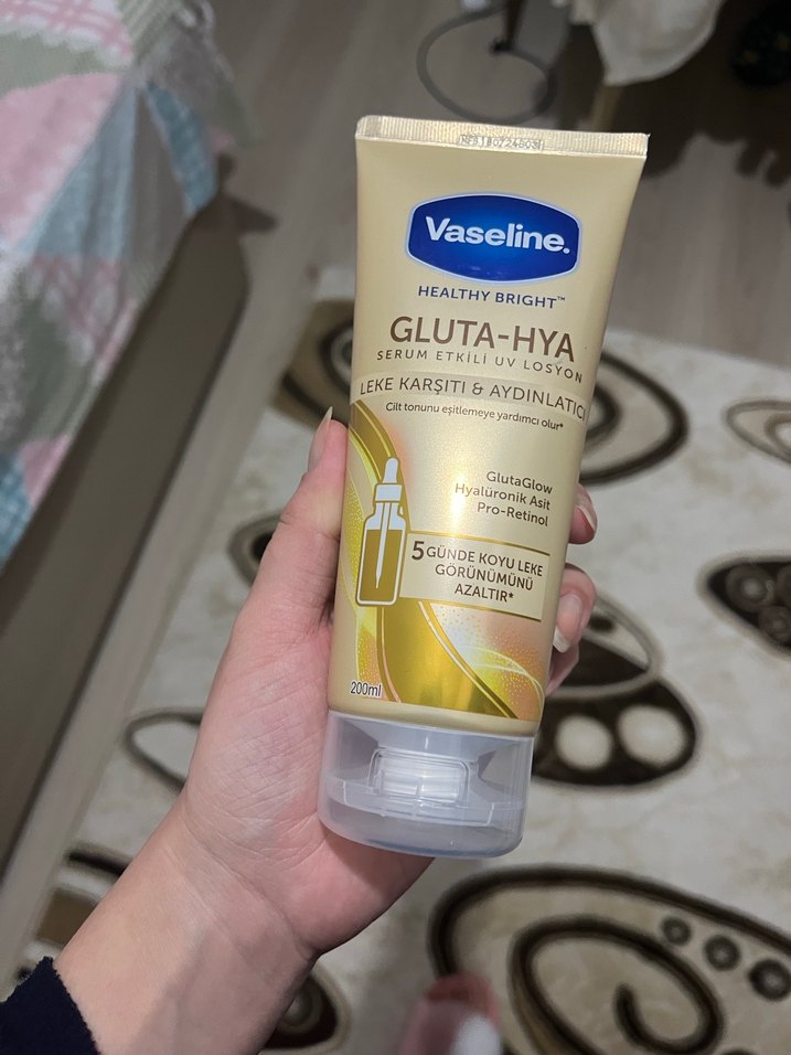 Vaseline Healthy Bright Gluta-Hya losyon, Gluta-Glow, hyaluronik asit ve pro-retinol ile koyu lekeleri azaltır ve cildi aydınlatır. 5 günde fark sağlar.