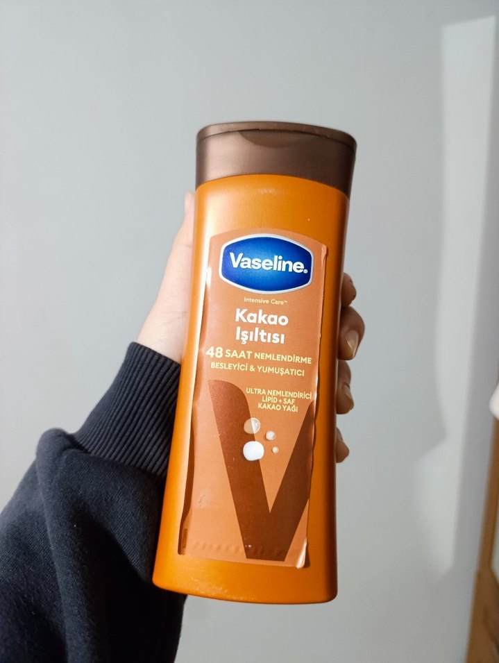 Vaseline Kakao Işıltısı vücut losyonu, ultra nemlendirme, kakao yağı ve tereyağı ile 48 saat nem sağlar, cildi besler ve yumuşatır.