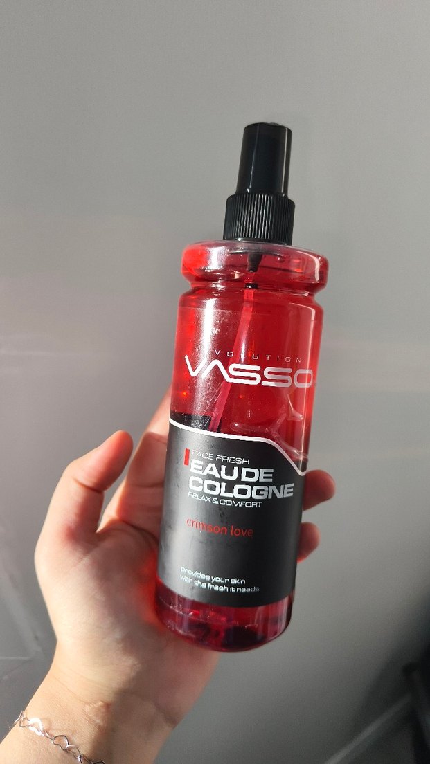 Vasso "Crimson Love" 370 ml hafif ferah koku veren parfümlü erkek kolonyası; cildi ferahlatan taze koku ve rahatlık sağlar günlük kullanıma uygun. Cilde veya kıyafete püskürterek kullanılır. Koku kalıcılığı: Orta‑hafif (parfümden daha hafif, body mist’ten daha belirgin)