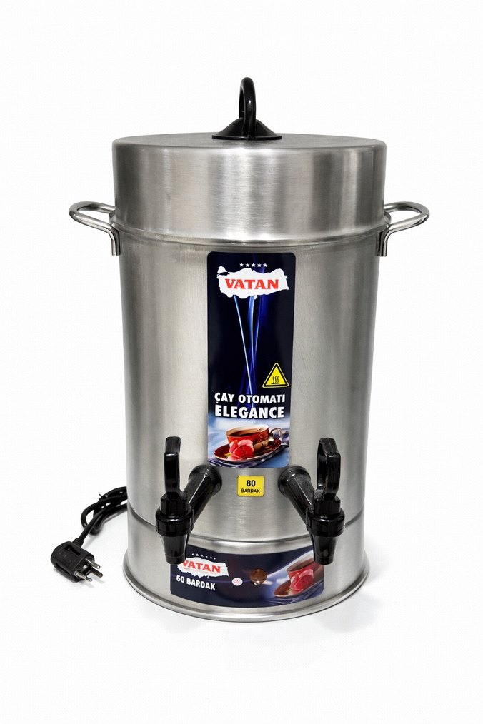 Vatan Elegance çay otomati, gri renkte, 80 bardak kapasite ve çift musluk ile kolay servis sağlar. Elektrikli kullanıma uygundur. Ürün sıfır kapalı kutu ile verilcektir