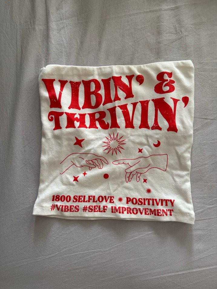 Beyaz yastık kılıfı üzerinde parlak kırmızı baskılarla olumlu mesajlar ve kendini geliştirme temaları yer alır. #Vibes #SelfLove gibi ifadeler bulunur. ✨