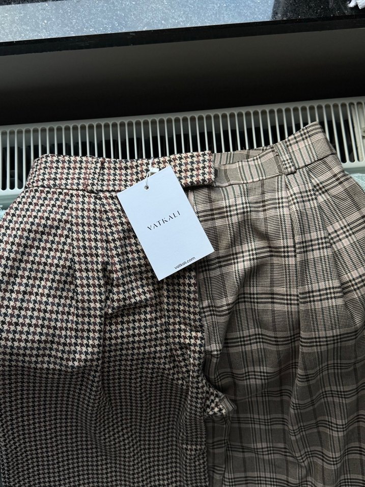 Ürün bana bol olduğu için satıyorum. Bej renkte, pileli ve ekose desenli kadın kumaş pantolon. Normal boy ve regular fit kesime sahip, günlük sokak modasına uygun.