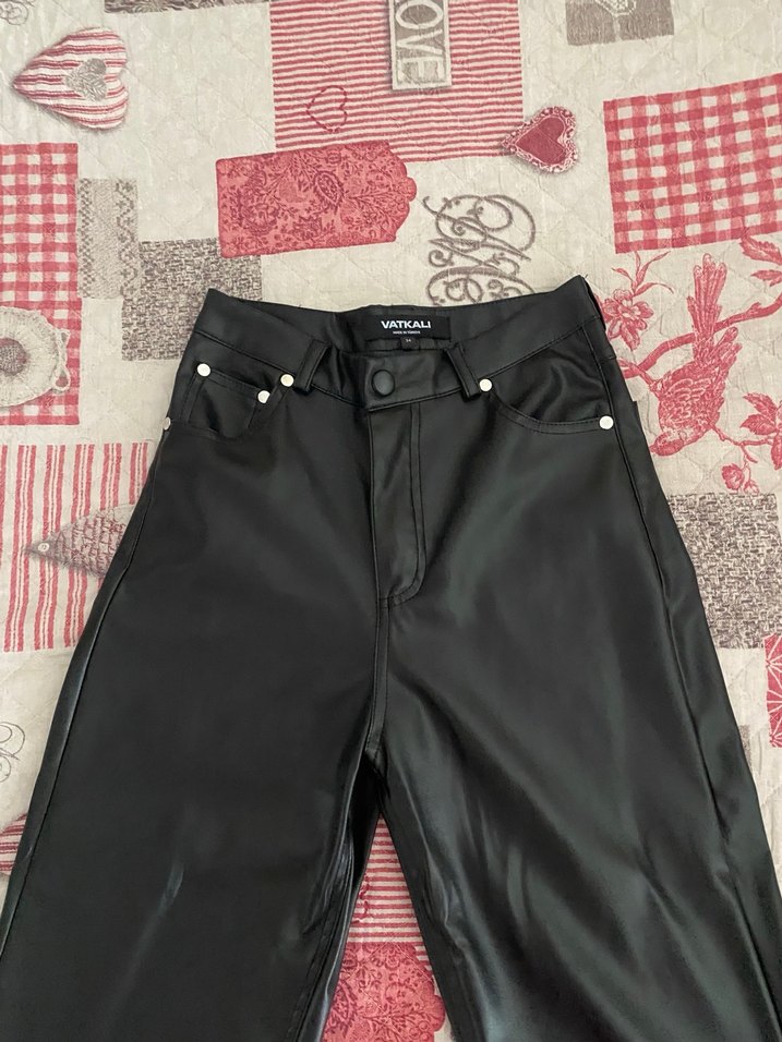 Siyah, deri kumaştan yapılmış, midi boy, dar kesim pantolon. Günlük kullanıma uygun, şık ve desen içermeyen tasarım. Sayılı giyildi temizdir