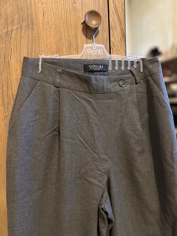Düğmeli, normal boyda, dümdüz gri keten kumaştan yapılmış, ofis için uygun rahat kesim kadın pantolon. Marka: Penti.