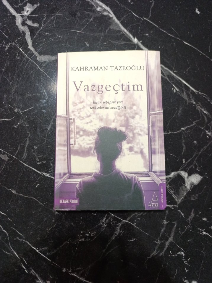 Kahraman Tazeoğlu'nun "Vazgeçtim" adlı romanı, aşk ve vazgeçme temalarını işler. Kapakta pencereye bakan bir kişi yer alıyor.