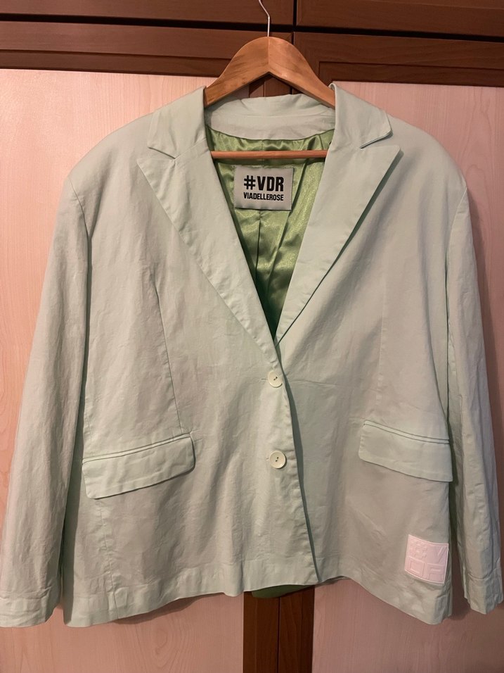 Pastel yeşil keten kumaştan yapılmış, düğmeli, uzun kollu ve normal boyda kadın blazer. Notch yaka ve sade tasarımıyla günlük rahat kullanıma uygundur. #VDR etiketi bulunur. Hiç kullanılmadı ve oversize kalıptır