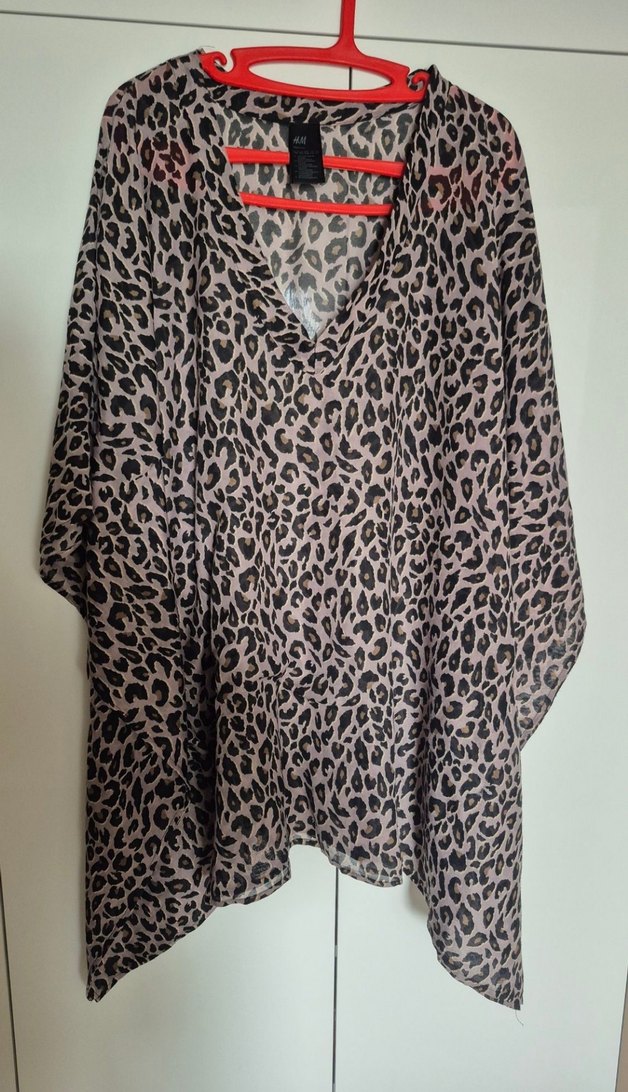V yaka, salaş kesim, dökümlü tasarıma sahip, kahverengi ve gri tonlarda leopar desenli bluz. Uzun kollu, yumuşak sentetik kumaştan, günlük kullanıma uygun.