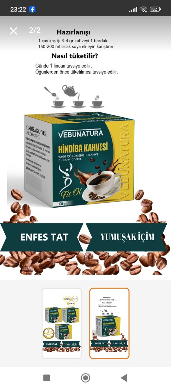 Vebunatura hindiba kahvesi, enfes tat ve yumuşak içim sunar. %100 çözünebilir hindibadan üretilmiştir, 100g paket.coklu almıştım biri ni satmak istiyor sıfır kutusunu atmıştım yer kaplıyor diye kavanozunda