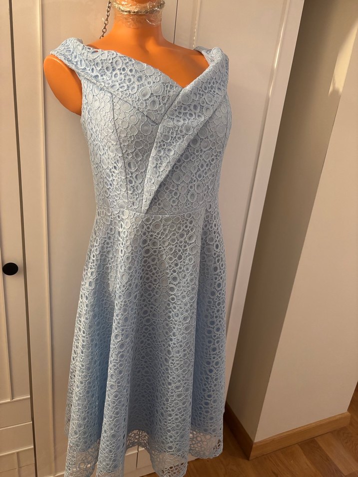 Sayılı kullanılmış ve yıkanmıştır, Vedat markasının zarif ve modern bir tasarımıdır. Mavi, astarlı, dantelli, midi boy bir model. Yaka ve korsaj detayı sayesinde feminen ve şık bir siluet. Balenli korsajlı, fermuar sağlam, astarlı, göğüs kısmı destekli. Esnek, polyester, yıkanabilir ütü istemez. Beden 42, göğüs 106, bel 80, etek 64, uzunluk 94 cm. Plastik manken 34 beden 82-58-82 cm. Herhangi bir sorunu yoktur. Tam 1950-1960 dönem vintage elbiseleri şıklığında V yaka, dantel detaylı, kolsuz, uzun kesim mavi abiye elbise. Düz desenli, klasik ve modern şıklık sunar.