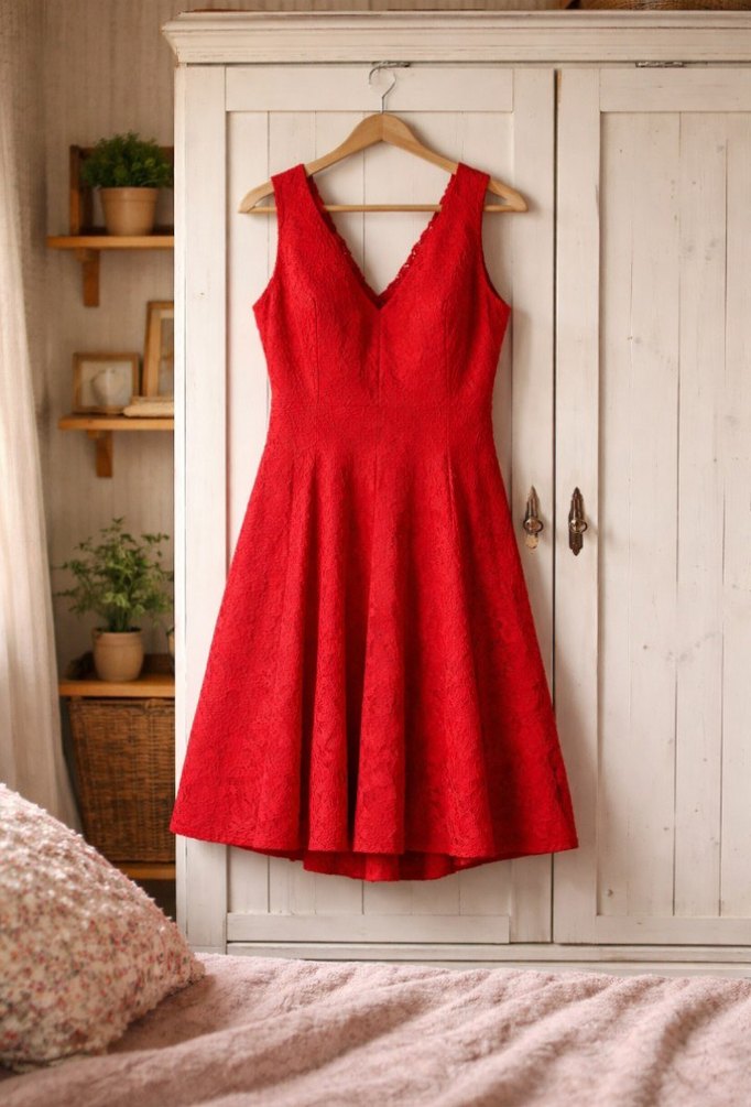 VEDAT Marka Şık Kırmızı Dantel Elbise (Büyük Beden) Ürün Detayları: Marka: Vedat (Made in Turkey) Beden: 48 Renk: Canlı Kırmızı Kumaş: Tamamı dantel işlemeli, astarlı Kesim: V yaka, kolsuz, belden aşağı genişleyen (A-line) kloş kesim. Özel günlerde, davetlerde veya şık bir akşam yemeğinde tüm bakışları üzerinize çekecek, çok şık bir parça. Belden oturan ve aşağı doğru dökümlü gelen kesimi sayesinde vücut hatlarını çok zarif gösterir. Dantel detayları kaliteli ve tok duruşludur. Göğüs kısmındaki v yaka detayı elbiseye modern bir hava katmaktadır. Durumu: Ürün temiz durumdadır, herhangi bir defosu veya söküğü bulunmamaktadır. Türkiye üretimidir. Kullanım Önerisi: Siyah veya dore topuklu ayakkabılarla kombinleyerek gecenin yıldızı olabilirsiniz!